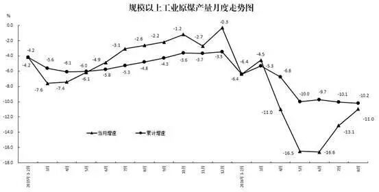 2016年1-8月份,全国规模以上工业1原煤产量21.8亿吨,同比减少2.5亿吨,下降10.2%;8月份,原煤产量2.8亿吨,同比下降11.0%。原煤产量已经连续5个月同比降幅超过10%,但与前3个月相比,8月份降幅有所收窄。