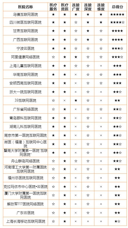 虽然2016年互联网医院集中建设,但是各家发展的成熟度还参差不齐,该报告从医疗服务、医疗资质、连接广度、连接深度、连接维度五大指标对25家已落地互联网医院进行了成熟度盘点。5项指标分别设置不打星、半颗星、一颗星相加得到总分,依总分评定成熟度。