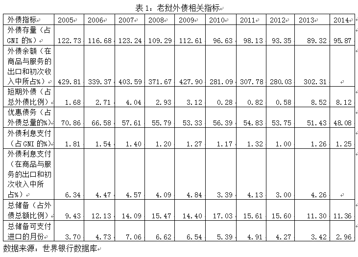 实际上,无论使用静态指标比率或是动态模型来衡量一国债务可持续性,得到的短期基本结论应该趋于一致,只是比率法应该考虑结合更多的外部因素加以分析。因此本文采用指标比率的方法来衡量老挝债务基本状况。再者,因老挝属于世界范围内重债穷国那一类国家,世界银行专门对这类重债穷国设定了一系列债务可持续性分析框架。因此,除了分析老挝基本普通的静态比率衡量指标,更多的考虑是结合世界银行标准对老挝的债务可持续水平进行更为合理的评价。