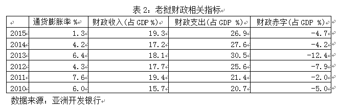 2016年老挝仍然要继续偿还欠款,但却增加了一些附加费用预算,主要用于以东盟主席国身份主办的一系列会议。为解决财政收入不足的问题,老挝政府自2015年10月起,加强税收征管力度,并在国内推行并严厉打击财务违规现象。从下表2看以看出,受益于全球性低油价和食品价格稳定的预期老挝国内的通货膨胀率保持在低位,但并不排除国际油价上升又使其国内通货膨胀率高涨,政府当前对宏观经济的把控较弱。实际上,从数据显示目前老挝削减财政赤字和抑制信贷快速增长的措施已经取得成效,但财政收入增长甚微,仍然处于收不抵支的状态,预计政府若要发展大型项目,仍然要靠外债和优惠贷款为主。
