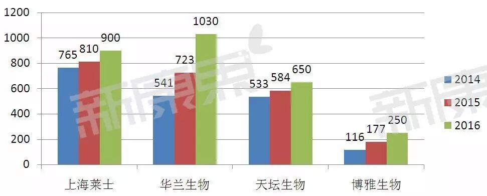 从采浆量来看,华兰生物以2016年采浆量1030吨位居榜首,并且其增长速度也十分亮眼,在采浆能力方面表现出更好的竞争态势。并且,从2016年浆站获批情况来看,2016年整个行业增加浆站数20家,其中,上海莱士3家,华兰生物3家,天坛生物2家,博雅生物2家,由此看来,华兰生物还将继续保持采浆量领先地位。
