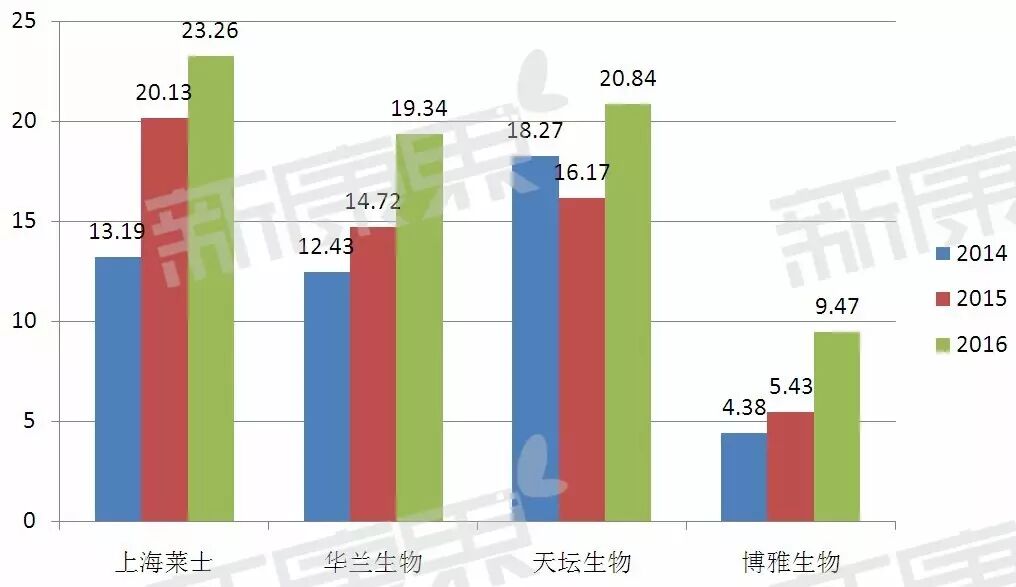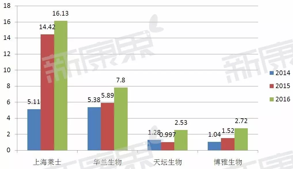 与2015年相比,营收及利润的增长率有较大下降——2015年两者的增长率分别为52.55%和182.35%。其原因在于,上海莱士2014年完成对郑州莱士及同路生物的并购,血制品种类增至11个,提高了血浆利用率,净利润也因此提高。
