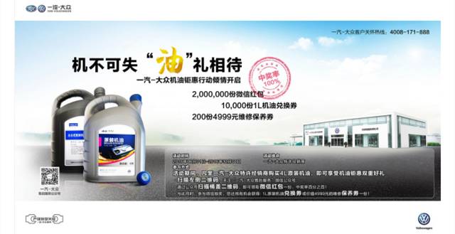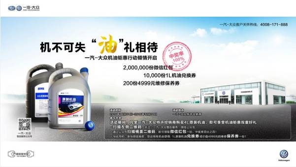 活动内容:活动期间,凡至一汽-大众特许经销商购买4L原装机油,即可参与本次活动。