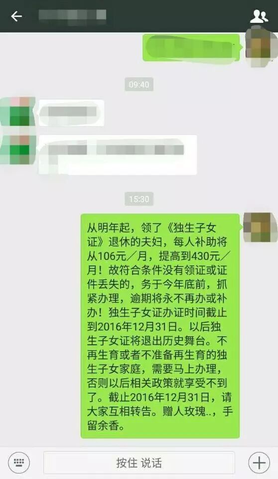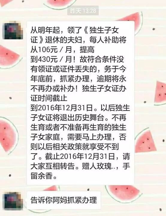昨天,网友“Sin”收到了家里长辈发来的一条微信消息,消息称:从明年起,领了独生子女证退休的夫妇,每人补助将从106元/月,提高到430元/月。故符合条件没有领证或证件丢失的,务必于今年底前抓紧办理,逾期将永不再办或补办!独生子女证办证时间截止到2016年12月31日。以后独生子女证将退出历史舞台。不再生育或者不准备再生育的独生子女家庭,需要马上办理,否则以后相关政策就享受不到了。截至2016年12月31日,请大家互相转告。