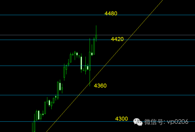 截止早上10点,白银最高点已经涨到4440附近,20.6美元。从15分钟K线图看,白银目前已经有效站稳4420点,一开盘就收了两个十字星。趋势还是看涨,逢低买涨,目标点位4470-80附近,等回调到4410-4380附近买涨,胆大的在4420买涨,止损不设,爆了就翻倍补仓,上述只是早盘的建议(12点前),错过失效。