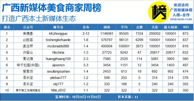 首页 | 美妆知识 | 广西新媒体美食周榜 | 2016\/10\/30-11\/05 广西新媒体美食周榜 | 2016\/10\/30-11\/05 2023-04-19 23:50:29 广西新媒体榜是广西创客中心孵化的移动互联网(新媒体)项目,隶属广西新媒体研究中心,线下社群为广西新媒体联盟,联合70多位新媒体创始人,运营的新媒体超过300个。广西新媒体排行指数榜,客观、中立评估,广西各地各行业新媒体行情变化掌握本地新媒体动态。冲榜请联系榜眼打榜手机、微信:15077119894数据来源:中国新媒体指数,本榜单仅针对本地自媒体统筹:刘基斌 审核:黄小玲 编辑:罗忠涛NCI计算公式