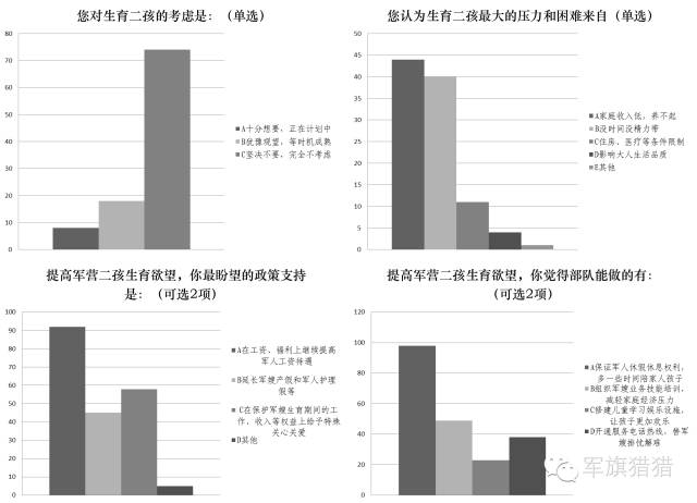 然而,政策出台数月后,某部300余名符合条件的官兵,仅有4人就生育二孩到计生办进行了备案。对50名军人(男)和50名军嫂的调查显示,军人(男)明确考虑生育二孩的仅有5人,占10%。军嫂的意愿更低,明确考虑生育二孩的仅有3人,占6%。