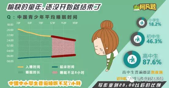 但没用,学校制定的规则不随我的意志而改变,毕竟不是只有我家一个小孩这样,我问了孩子,女儿说全校都这样,有的学校甚至还更早。后来知道,还不只是北京,基本全国的中学生都是这样。报纸上称,一项历时15年的调查显示,我国7成以上中小学生睡眠不足。根据国际标准,小学生每天应睡10个小时,包括高中生在内的中学生每天应睡9小时。而最近一份网上调查显示:70%以上的中学生10点前无法做完作业。如果以10点入睡,6点半起床这一理想的时间计算的话,这意味着70%以上的中小学生的健康正严重受损。