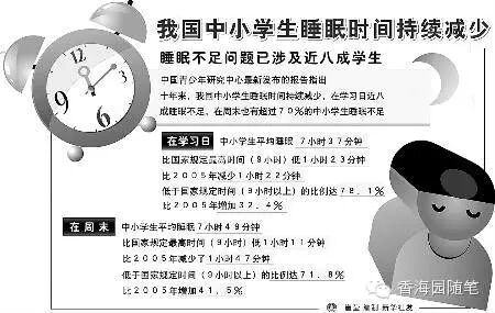 一个学期下来,女儿小小年纪每天睡眠时间不到七小时,眼袋总是黑黑的,一看就是睡眠不足的样子,据说她们班上有的孩子甚至不到六个小时。后来我就上百度查了一下,经验表明,慢性睡眠不足对孩子学习记忆功能的损伤具有隐匿性和不可逆性。如果孩子长期睡眠不足,其记忆力、运算能力就会下降,如英语单词前背后忘,做题目总是粗心。