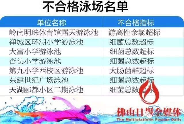 日前,市卫生监督所公布今年佛山全市游泳场所第一阶段专项检查和抽检情况:此次抽检的75个游泳场所水质合格率为90.7%,7家游泳场所水质不合格。