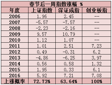 无忧君经过统计后发现,从2006年至2016年,春节过后一周三大指数以上涨居多,其中: