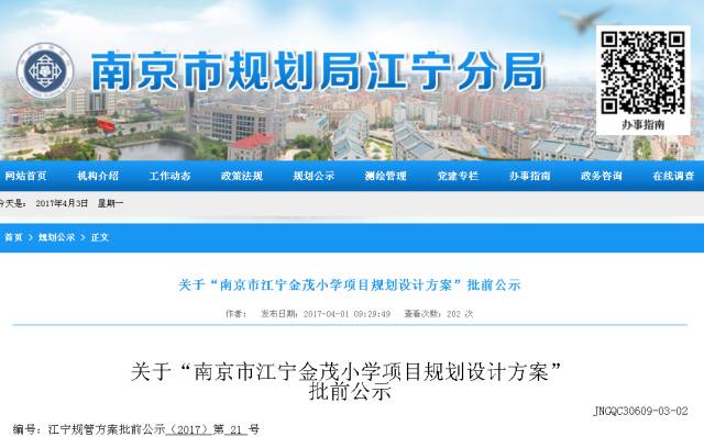 4月1日,南京江宁规划局公布了南京市江宁金茂小学(琅琊路小学江宁分校)的规划公示,规划用地性质为A33a小学用地,拟新建30班小学。