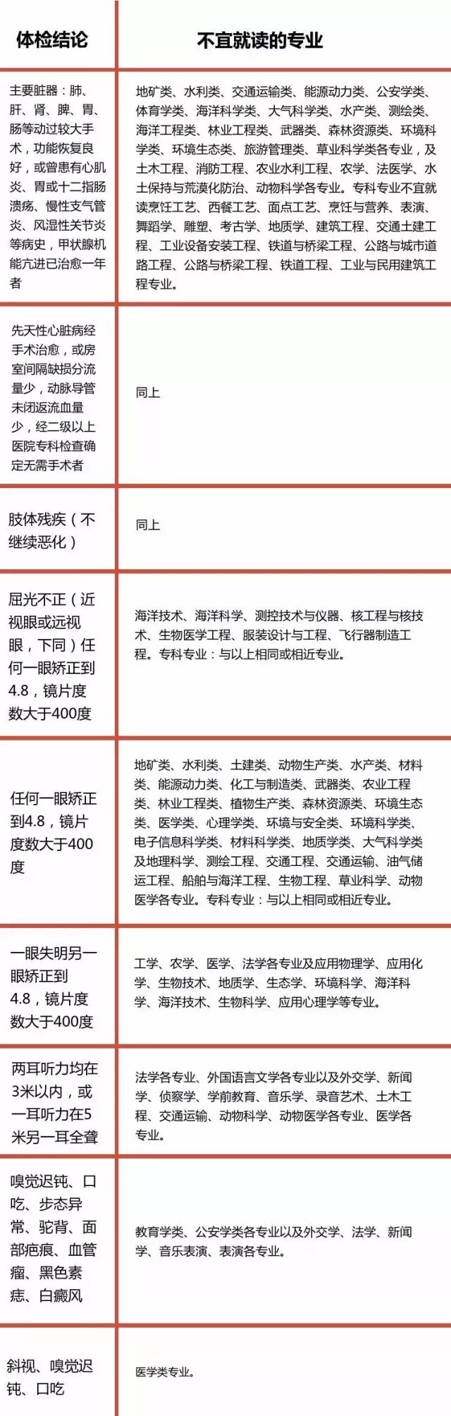 另外,在《指导意见》第三部分中还有不适宜就读的相关专业。这类考生患有某些疾病或某种生理缺陷,身体条件符合《指导意见》第三部分中的某些条款,主要是因为视力不足、屈光不正、听力障碍、重大手术、肢体残疾等原因不宜就读某些专业。