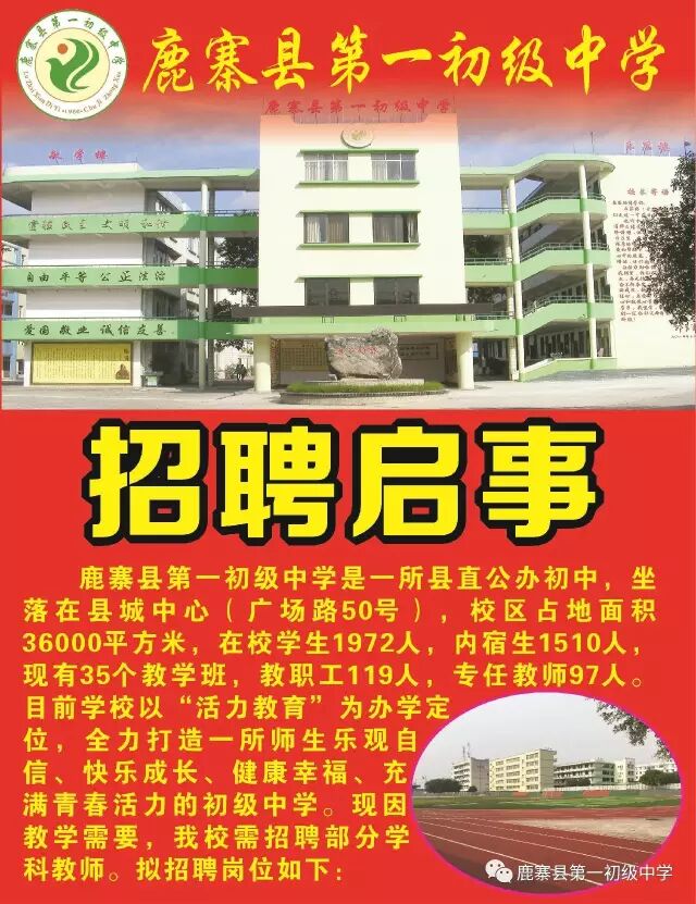 2017年鹿寨县第一初级中学教师公开招聘岗位:语文4人,数学7人,英语4人,物理1人,化学1人,,历史1人,生物1人,地理2人。我们已经做好了准备,你还在观望什么呢?赶紧坐到您的电脑前,打开IE搜狗火狐猎豹各种浏览器,进入www.gxeea.cn选中我们的岗位报名吧!!!