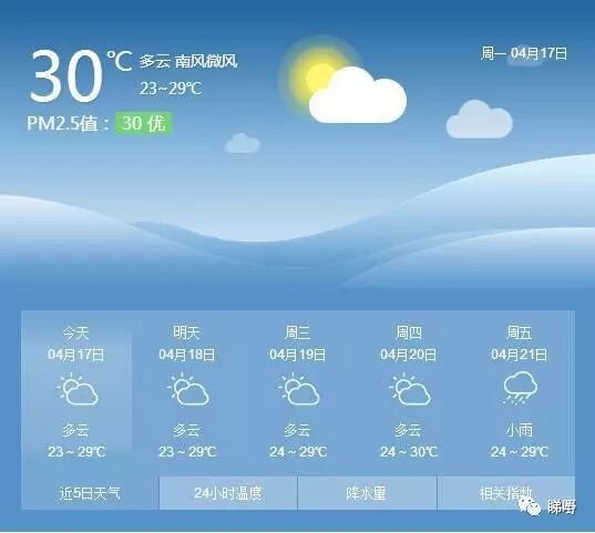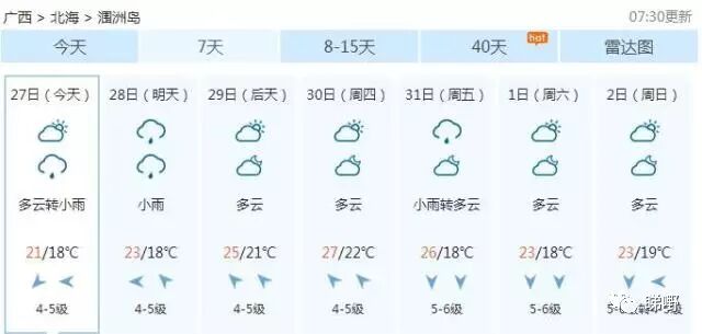 18日,北海市,阴天到多云,偏南风2〜3级,气温23〜29°C;北部湾海面,阴天到多云,偏南风4 〜5级。