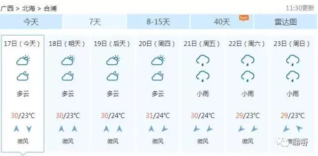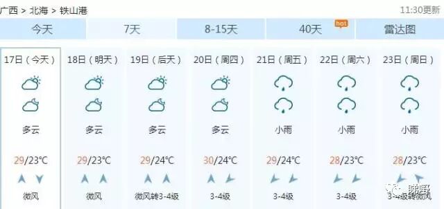 17日,北海市,阴天到多云,有分散阵雨,南转北风2〜3级,气温23〜29°C;北部湾海面,阴天到多云,有分散阵雨,南转北风4到5级。
