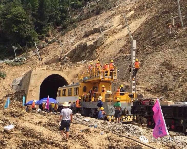 7月17日,连日暴雨致湖南古丈县默戎镇境内的焦柳铁路万岩至龙鼻嘴区段4处山体溜坍,一处40米区段铁轨道床被雨水冲空,特别是12时03分龙鼻2号隧道出口上方发生大面积山体溜塌,溜坍土石达1万多立方,掩埋线路140余米,铁路运输因此中断。