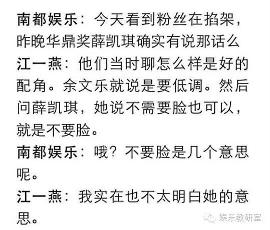 她和薛凯琪有过一次撕逼是在华鼎奖的颁奖上,薛凯琪是颁奖嘉宾,薛问余文乐怎么做好一个女配角,余文乐说不能盖过女主角的风头,薛说那就是江一燕了,电影里都看不到她的脸,余文乐当时简直黑人问号啊,然后颁奖名单是江一燕,薛继续说,原来不要脸就可以了。