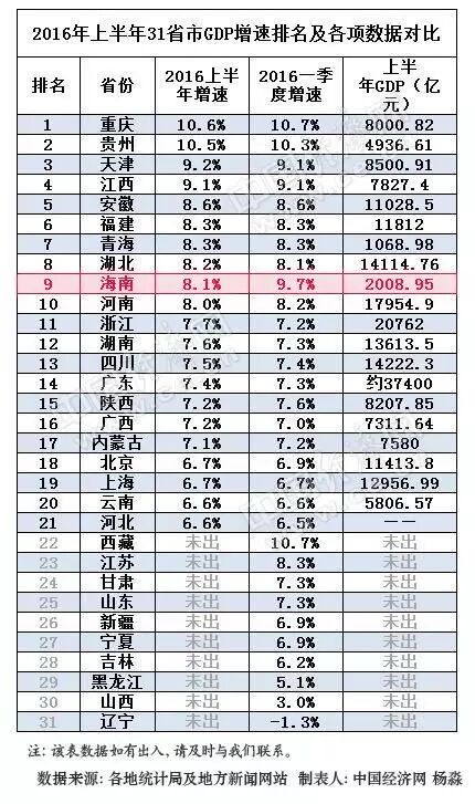 2016年上半年31省区GDP增速排行榜。(持续更新......)