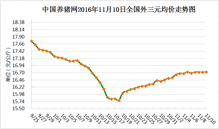 猪价在十月触底反弹之后平稳上涨,眼看就要涨到17元/公斤了,但是天气降温似乎把猪价的上涨也给冻住了,近一周,猪价上涨停滞,尽管今日猪价见红,但是涨幅微弱。什么时候猪价才能涨到17元/公斤呢?从供需双方来看,猪价将在近期涨到17元/公斤!首先让我们着眼与供应端,寒潮的威力开始显现,据安徽省民政厅消息,安徽部分生猪被冻死,而此次寒潮侵袭了我国较多省市,不可能仅有安徽的生猪被冻死,在生猪供应终端,猪源减少将有利后期猪价的上涨;而从需求方面来考虑,前期的雨雪天气不利于腊肉的制作,近两日南方多地放晴,各地市民将陆续开始腌制腊肉,也就是说需求将慢慢主导猪价上涨。