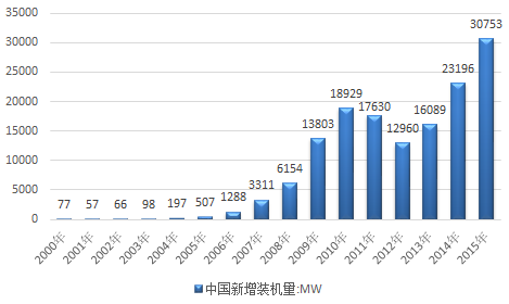 2000-2015年中国风力发电新增装机量统计图