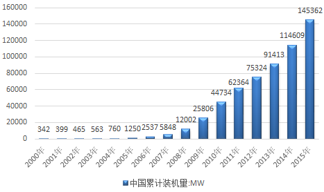 2015年,中国风电装机量再创新高。全国累计安装风电机组92981台,累计装机容量145362MW,同比增长26.8%。