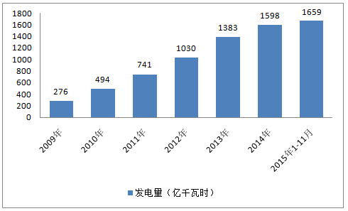 2009年我国风电发电量为276亿千瓦时;2015年1-11月我国风电发电量为1659亿千瓦时。