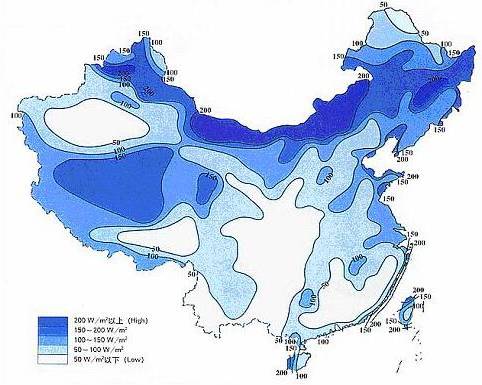 (c)内陆风能丰富区:风功率密度一般在 100 瓦/平方米以下,但是在一些地区由于湖泊和特殊地形的影响,风能资源也较丰富。
