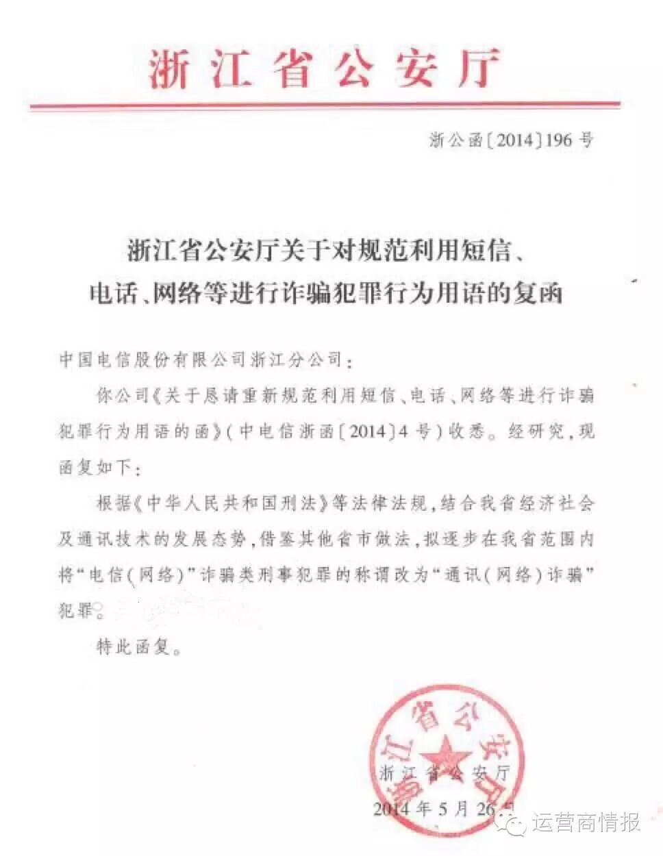 中国电信一直在与各地公安机关就重新规范利用短信、电话、网络等进行诈骗犯罪行为用语保持良好沟通。据了解,自2014年开始,浙江、湖南、重庆、广西等多地省级公安厅陆续以函复的形式,正式公告将“电信诈骗”犯罪称谓,统一规范为“通讯(网络)诈骗”犯罪。