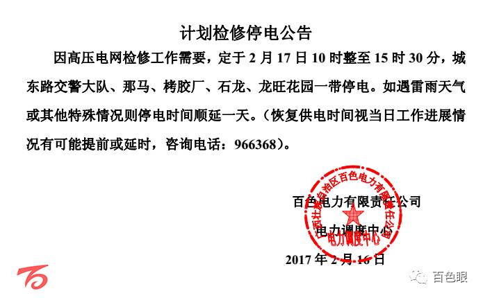 因高压电网检修工作需要,定于 2 月 17 日 10 时整至 15 时 30 分,城东路交警大队、那马、栲胶厂、石龙、龙旺花园一带停电。如遇雷雨天气或其他特殊情况则停电时间顺延一天。(恢复供电时间视当日工作进展情况有可能提前或延时,咨询电话:966368)。