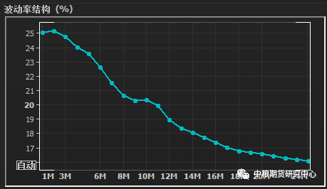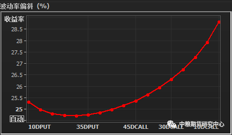 本周ICE白糖期权波动率曲面,依然维持近月高于远月,看涨高于看跌的特点。最高的波动率出现在2个月后到期的6月期权上。
