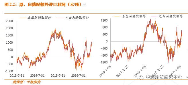本周,内外糖价纷纷走弱,但国内表现略显坚挺,配额外进口利润维持增长态势。本周巴西原糖配额外进口利润(比日照)周环比增加100元/吨至1100元/吨左右,泰国白糖配额外盘面进口利润周环比增加130元/吨至450元/吨左右。