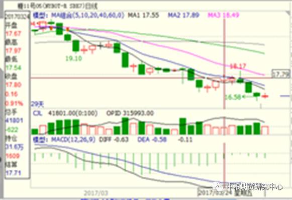 前兩周我們說到『上周我说先等待3/23日之后看三天定盘法则表态后再决定位阶,现在一轮完整的短线型态走完了,平台-下跌-回涨,所以可以决定区间了,美11号国际糖1705价格拉回20日均线可以做箱型顶部空单,目前20日均线18.49每天以0.12的速度下行,如下图,跌破17.02或左右的十字星可以回补平仓,不做多单』。請看下圖行情確實反彈到18.17就是粉紅色均線的空點位置,然後下跌破低點17.02最低來到16.58, 已經可以回補空單。然後必須等待新的多空訊號,指標會告訴量化交易者,所以本週不交易。以上顏兆陽責任編輯。