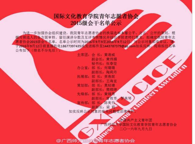 首页 | 美妆知识 | 国际文化教育学院青年志愿者协会 2015级会干名单公示 国际文化教育学院青年志愿者协会 2015级会干名单公示 2023-04-19 23:50:29 国际文化教育学院青年志愿者协会2015级会干名单公示为进一步加强协会组织建设,我院青年志愿者协会的换届选举本着公平、公正、公开的原则,根据对候选人的各方面审核、留任演讲分数及互评考核情况并综合学院老师们意见,拟确定我院青年志愿者协会2015级会干名单,名单公示时间为2016年9月9至2016年9月12日。对公示对象如有异议,请于2016年9月12日前直接致电18677397435或发送邮件至1443787379@qq.com如实反映。现将拟任名单公布如下(排名不分先后):主席团:会 长:黄港威 副会长:黄炜媚 :张春坚办公室:部 长:何璐璐 副部长:陶莉丹拓展部:部 长:贲燕妮 副部长:王海宜策划部:部 长:莫轻瑭 副部长:樊锦婷先锋部:部 长:黄锦秀 副部长:曾雨芳、罗美琴宣传部:部 长:陈美竹 副部长:梁 莉如实反映公示对象的有关问题受法律保护。 中国青年团广西师范大学 国际文化教育学院青年志愿者协会 二〇一六年九月九日具体名单已张贴在行政南楼314前的公示栏