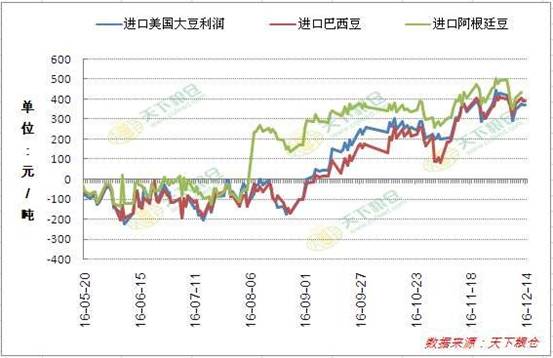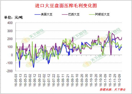 正是因为榨利丰厚,油厂进口意愿增强,未来几个月到港量庞大,据我们最新全面调查显示,2016年12月份国内各港口进口预报到港139船889.95万吨,显著高于11月份的783.05万吨。初步预计1月份进口到港量仍将高达800万吨左右。
