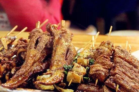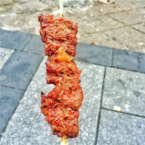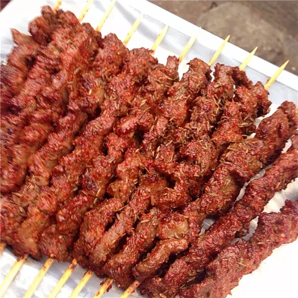 以辣椒、孜然等各种调料混合的秘制配方,加牛油腌制,吃起来肉汁细嫩富有弹性,牛肉本身的嚼头和孜然的纯香、辣椒的辣味浑然一体,绝非一般的烧烤可比,大块大块吃起来爽,4串管饱。