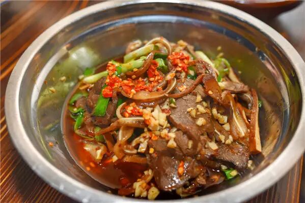 牛肉、猪耳、脆骨、韭菜、豆皮等放入卤锅5-6分钟,再拌好特调的油辣椒,端上满满一个大铁盆子。四合一的卤味任选2荤2素,卤药味较淡,反而是油辣椒的香更突出。