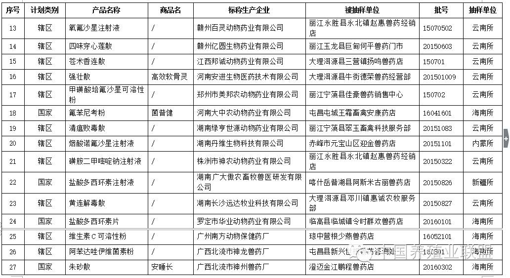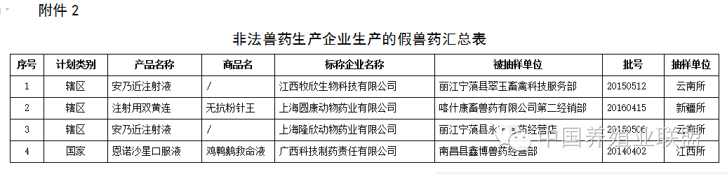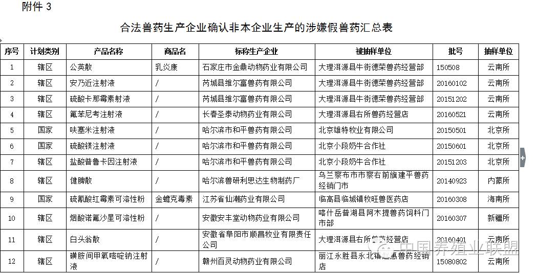 近日,云南省兽药监察所等6个省级兽药检验机构报送了2016年10月兽药监督抽检中经抽样确认的52批假兽药相关信息。其中,非法兽药生产企业4家(附件1),涉及假兽药4批(附件2);合法兽药生产企业确认非本企业生产的涉嫌假兽药48批(附件3)。,。