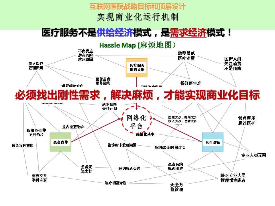 上图被称为“麻烦地图”,互联网+医疗和远程医疗希望有效地解决其中的部分环节,实现商业化目标。