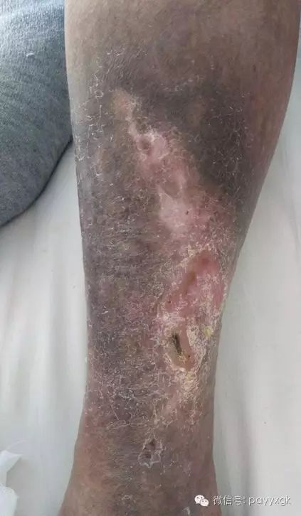 记得有这样一位患者,54的徐女士是广西桂林人,20年前无明显诱因出现左下肢肿胀、疼痛,步行后沉重,经抗炎、镇痛治疗,效果不佳,病情逐渐加重,伴左下肢静脉迂曲扩张,左足靴区皮肤色素沉着。2013年左下肢肿胀、疼痛急性加重,皮色发红伴皮温增高,当地医生考虑是“急性左下肢深静脉血栓形成”,给予取栓术治疗,术后左下肢红热、疼痛症状改善,肿胀缓解不明显。出院后长时间抗凝、活血通络治疗,症状反复发作。2016年徐女士左下肢肿胀、疼痛再次加重,伴有瘙痒,左小腿足踝处出现溃破,久不愈合,迁延扩大,溃疡大小约6.7*7cm,可见大量脓性分泌物,皮温高,腓肠肌紧韧。当时血管彩超提示:双髂、双下肢静脉血栓形成伴部分再通,双下肢静脉瓣膜功能不全。