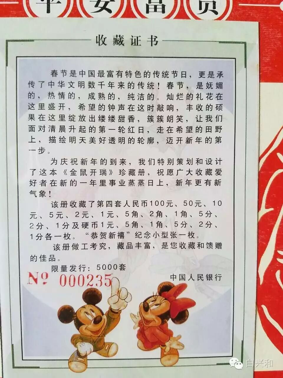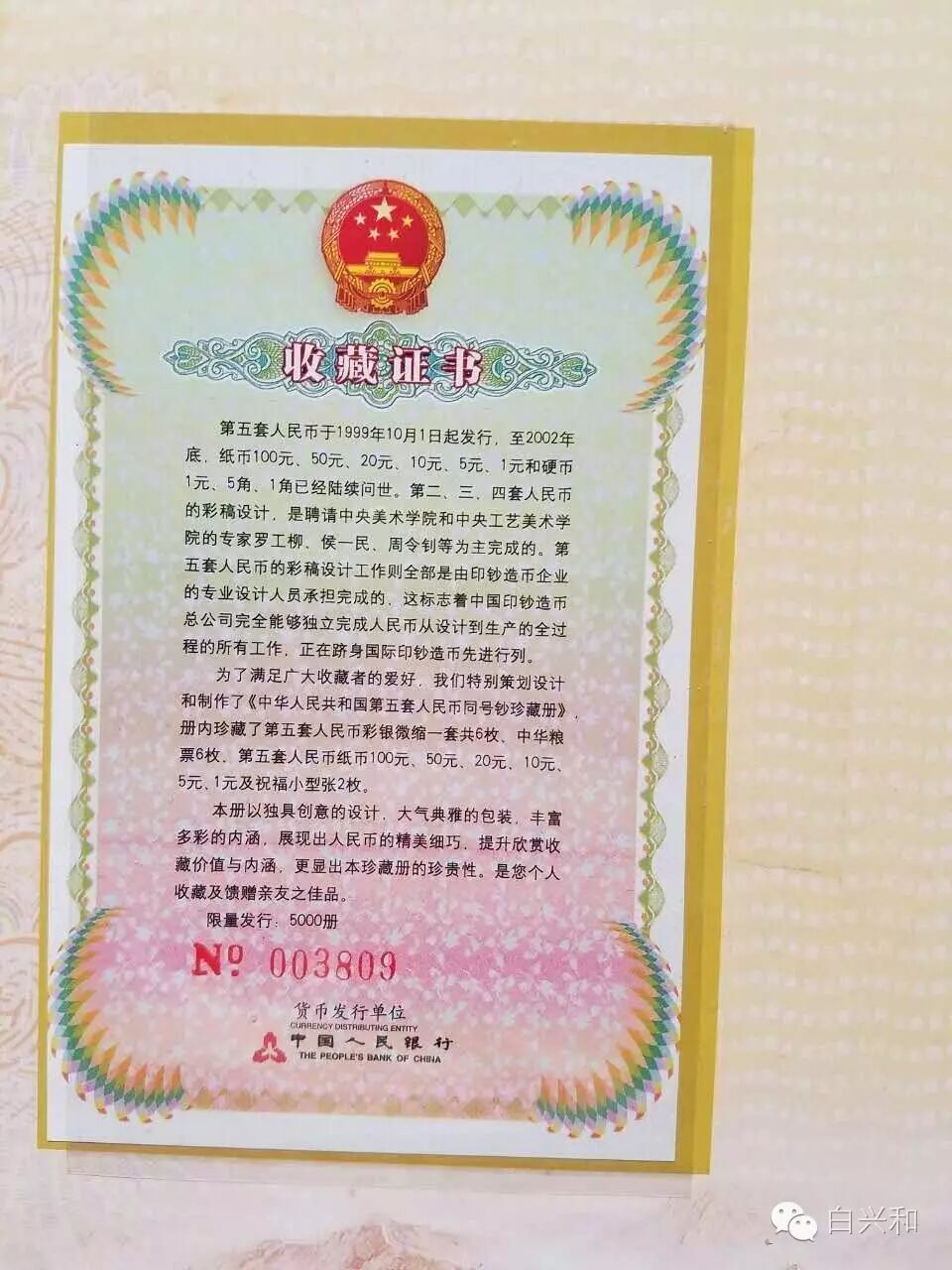 【序号】33-21号 【名称】建国钞康银阁装帧册 【年代】1999 【材质】纸 【尺寸】标准,全新直版,康银阁装帧册。 【描述】建国50周年纪念钞,康银阁装帧册,全新直版,品像如图,升值空间大,值得收藏的品种。包真,放心拍。 【起拍】无底价。 【估价】350元以上。 【佣金】买卖双方各3%,卖家包邮。