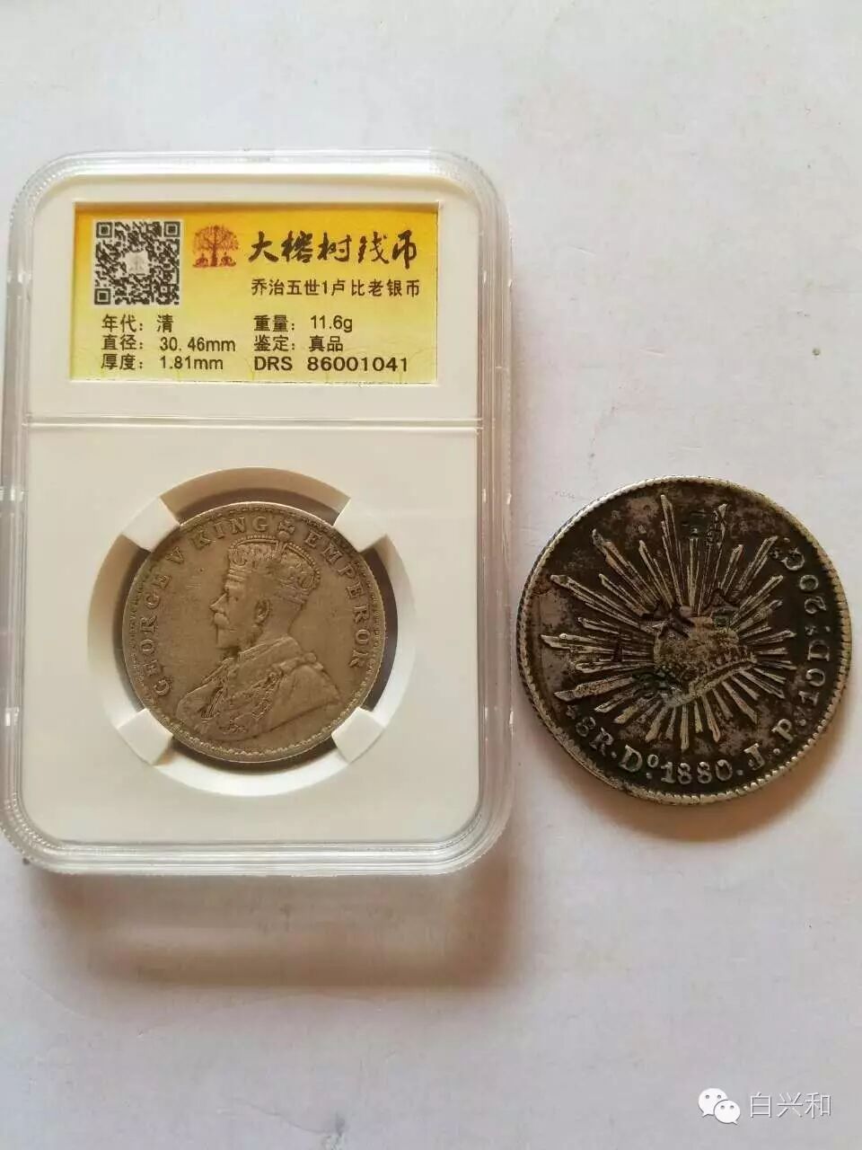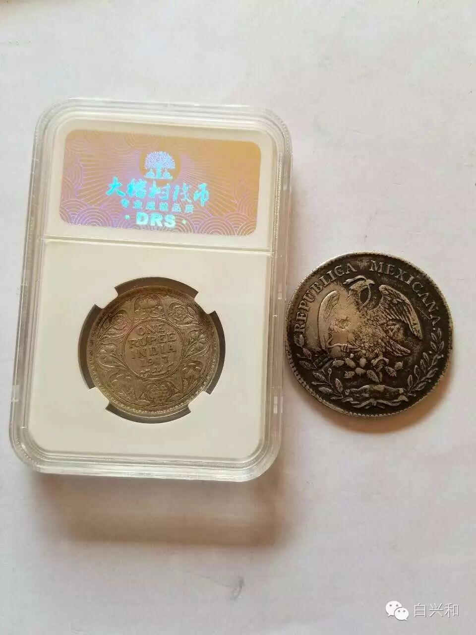 【序号】33-9号 【名称】印度卢比墨西哥鹰洋2枚合拍 【年代】1917 1880年 【材质】银 【尺寸】标准。 【描述】印度卢比银币品不错。墨西哥鹰洋,打有鉴定戳印,品像如图,升值空间大,值得收藏的品种。包真,放心拍。 【起拍】无底价。 【估价】500元以上。 【佣金】买卖双方各3%,卖家包邮。
