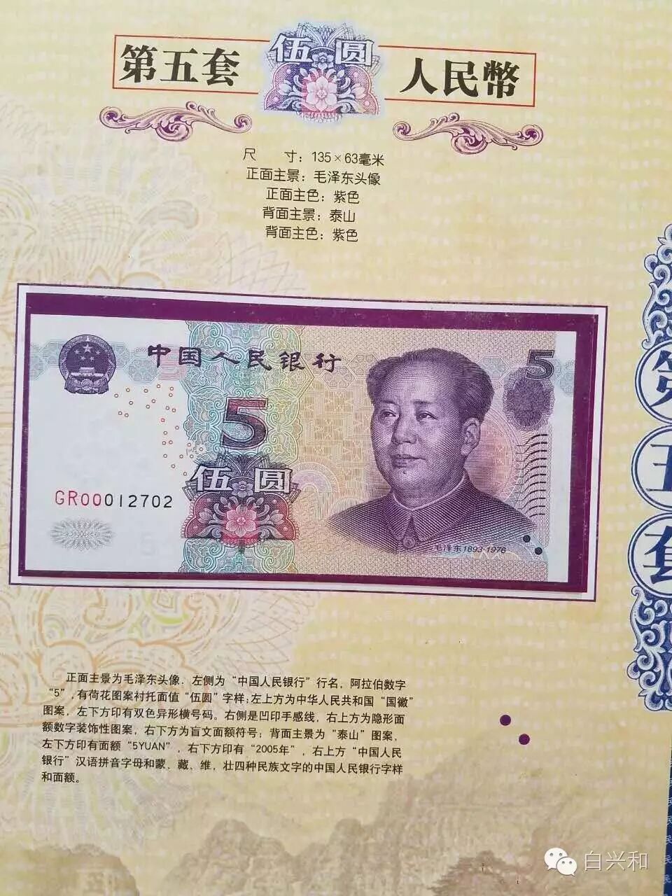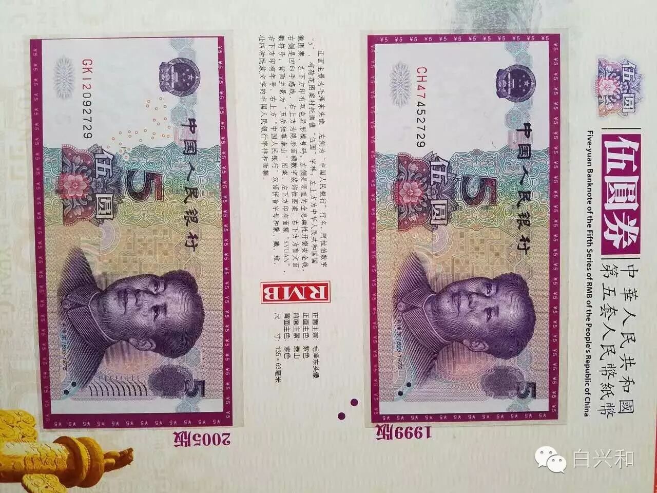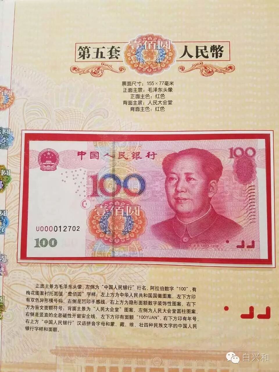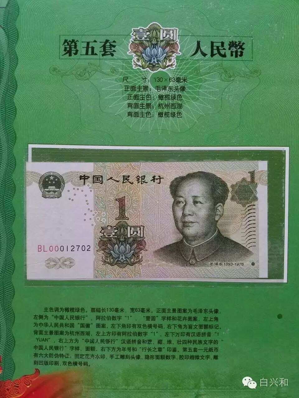 【序号】33-23号 【名称】五套人民币尾四同大全套珍藏册 【年代】1999 2005 【材质】纸 【尺寸】标准,全新直版。 【描述】五版人民币尾四同大全套珍藏册,全新直版,品像如图,升值空间大,值得收藏的品种。包真,放心拍。 【起拍】无底价。 【估价】800元左右。 【佣金】买卖双方各3%,卖家包邮。