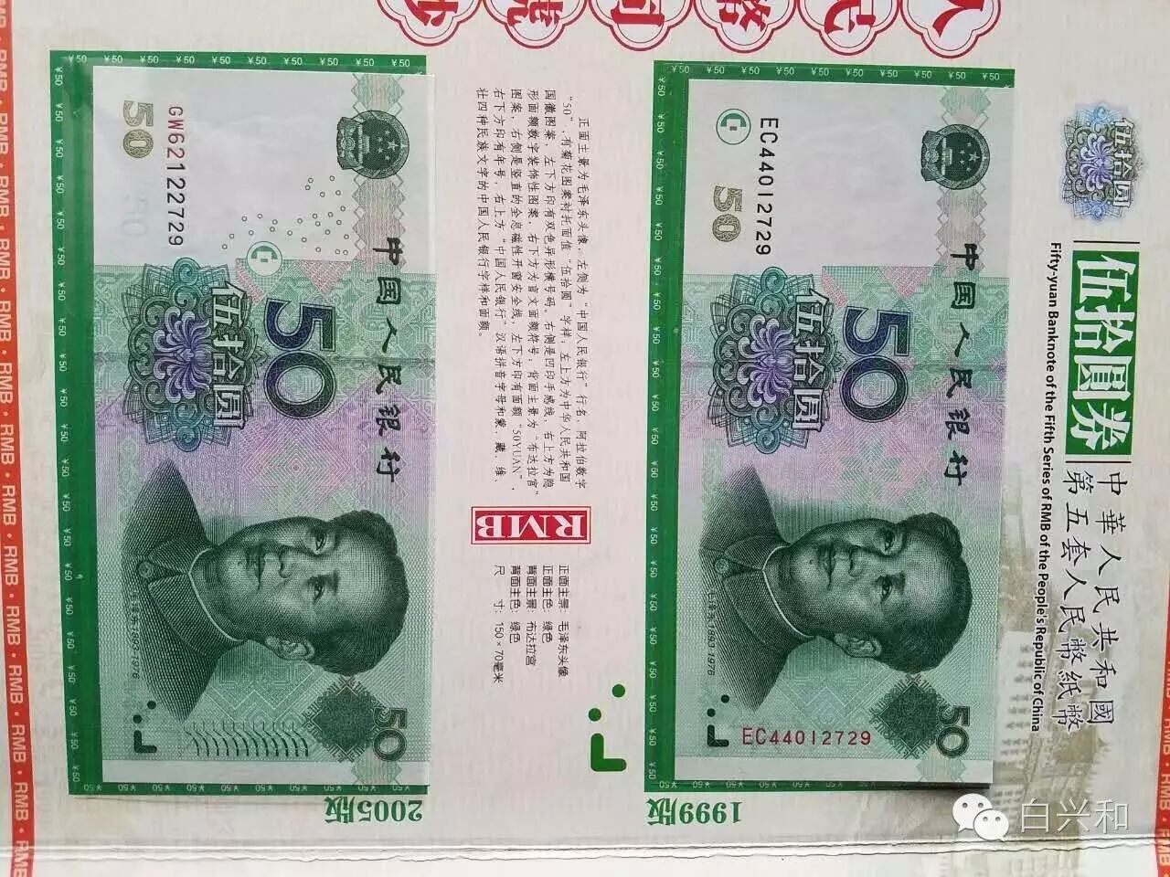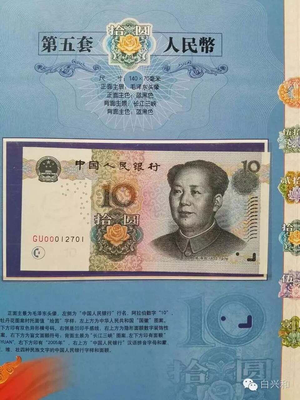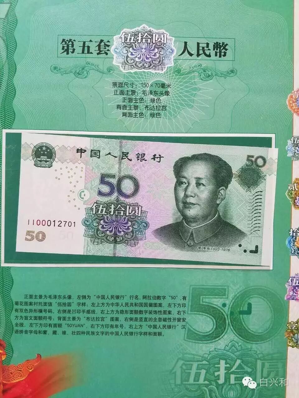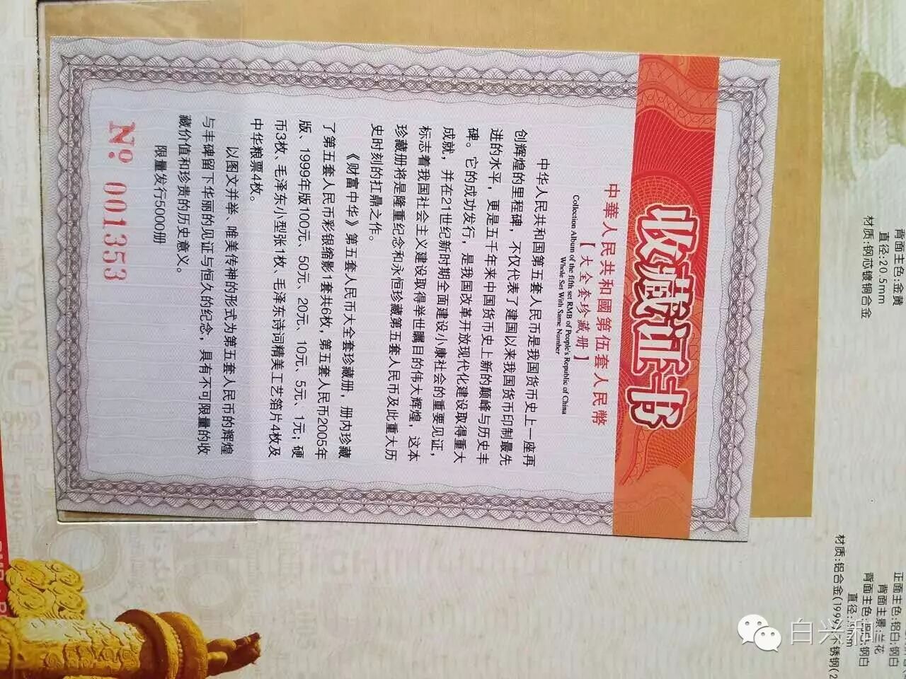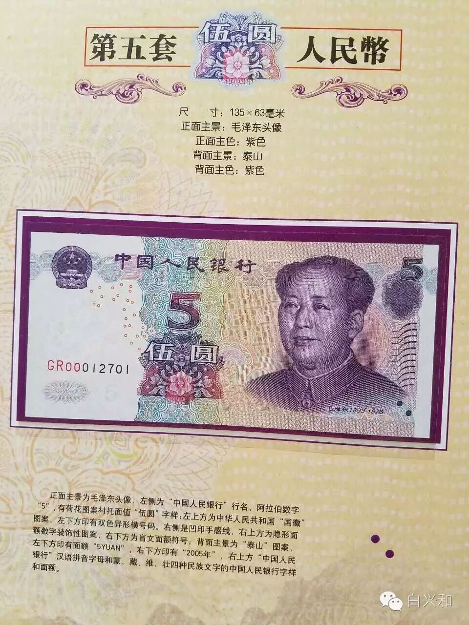 【序号】33-23号 【名称】五套人民币尾四同大全套珍藏册 【年代】1999 2005 【材质】纸 【尺寸】标准,全新直版。 【描述】五版人民币尾四同大全套珍藏册,全新直版,品像如图,升值空间大,值得收藏的品种。包真,放心拍。 【起拍】无底价。 【估价】800元左右。 【佣金】买卖双方各3%,卖家包邮。