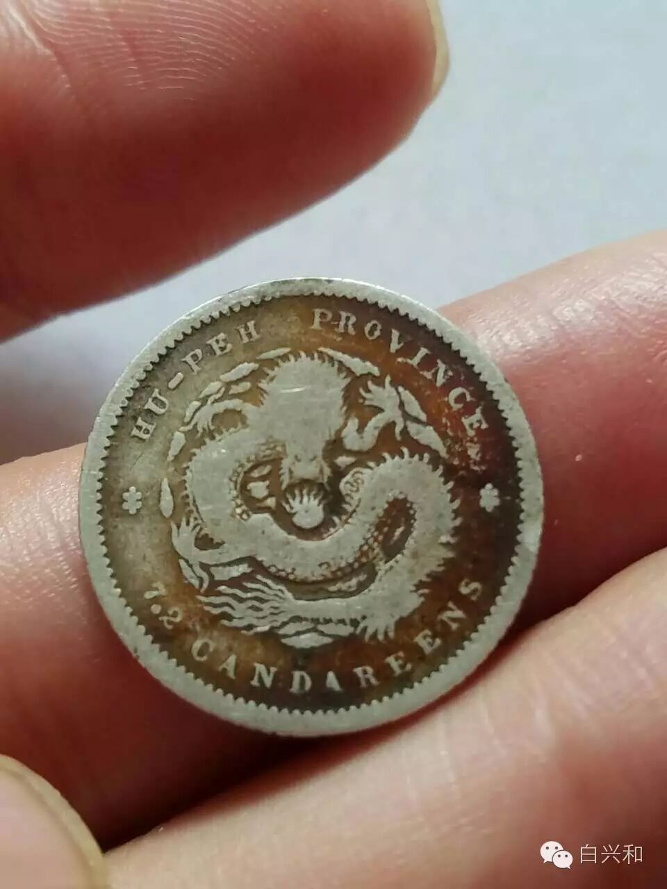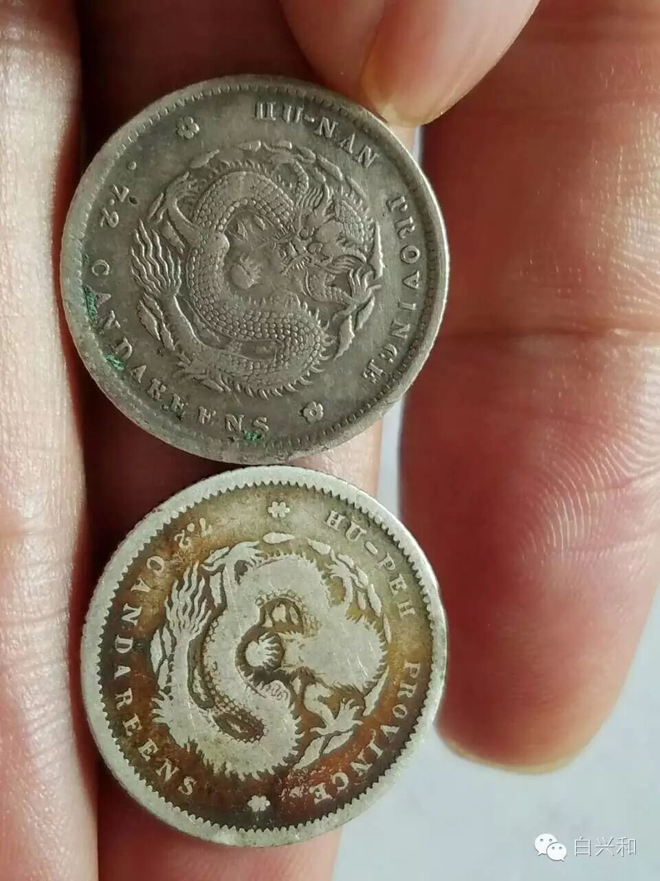 【序号】33-8号 【名称】湖南湖北七分二厘银币2枚合拍 【年代】清 【材质】银 【尺寸】标准。 【描述】湖南光绪七分二厘银币,品不错,边齿完整。湖北七分二厘银币,面五彩包浆,背龙鳞有流通磨损,品像如图,升值空间大,值得收藏的品种。包真,放心拍。 【起拍】无底价。 【估价】400元以上。 【佣金】买卖双方各3%,卖家包邮。