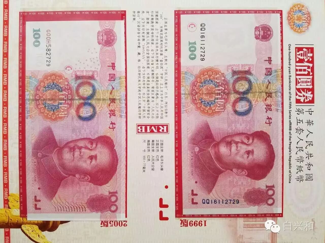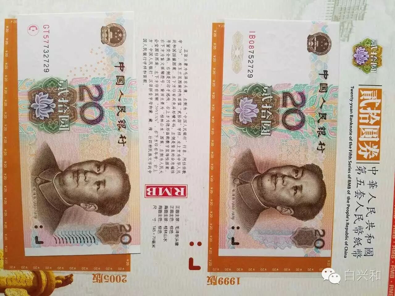 【序号】33-24号 【名称】五套人民币全同号小全套珍藏册2本合拍 【年代】2005 【材质】纸 【尺寸】标准,全新直版。 【描述】五版人民币全同号小全套珍藏册2本合拍,2本全同号连码,全新直版,品像如图,升值空间大,值得收藏的品种。包真,放心拍。 【起拍】无底价。 【估价】800元左右。 【佣金】买卖双方各3%,卖家包邮。