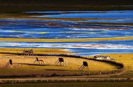 秋冬来临,草原一片金黄,而背面皑皑白雪的辛雅拉雪山山峰倒影于湖泊之中,黑颈鹤、黄鸭、斑头雁在草丛中、水面上嬉戏,更是为空灵的草原带来了生机。