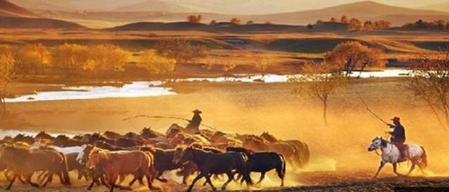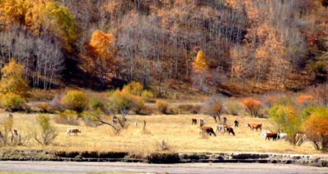 木兰围场的秋天是热烈、变幻而壮美的,成群的棕色骏马,或低头嚼食,或纵身奔腾。让人忍不住想高歌一曲“让我们红尘作伴,活得潇潇洒洒,策马奔腾,共享人世繁华......”