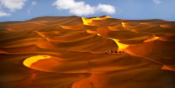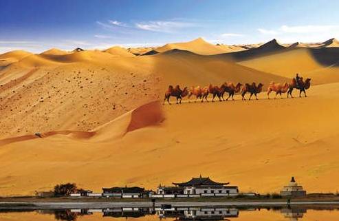 这沙漠瀚海,粗犷豪迈、雄壮辽阔!沙垄,宛若憩息在大地上的条条巨龙,沙丘群,呈各种蜂窝状、羽毛状、鱼鳞状沙丘变幻莫测。