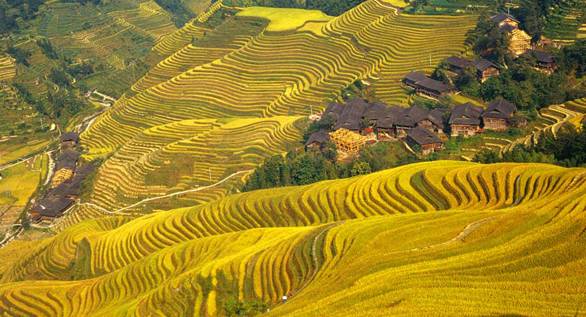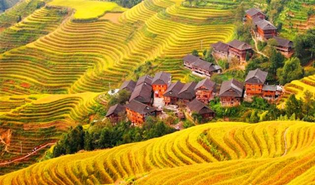 龙脊梯田秋天里,这层层叠叠的金黄,其实是金灿灿的稻谷。丰收的季节里,稻谷在梯田里“笑弯了腰”,山风吹来,翻滚着金色的稻浪。
